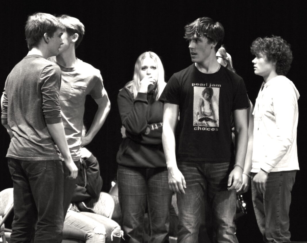 According to their teacher, Mr. Wagoner (played convincingly by JHS Junior Winter Wagoner), it takes about 10 years, or 10,000 hours, to become a genius at something, but you must focus on one thing alone. Wagoner uses John Lennon as an example, and he foreshadows violence by referencing Lennon was shot and killed 42 years the very day the play is set. Still, you don’t see the shooting coming. How could you? The way the play is set up it appears to be just another day. There is the typical amount of horseplay, but despite it there is reverence for the teacher and genuine interest in the discussion. The students start thinking about what they’d like to see their 10,000 hours go toward, and this really amplifies once they are suddenly faced with the reality of how fragile and fleeting life can be.