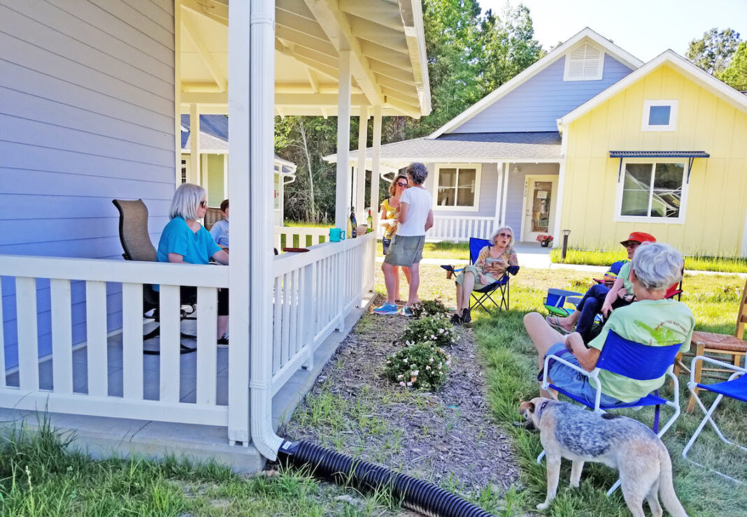 The newly built Village Hearth Cohousing community in Durham, North Carolina. The 28-house community is for people age 55 and over and welcomes LGBT residents as well as allies. (Photo by Margaret Roesch/Village Hearth).