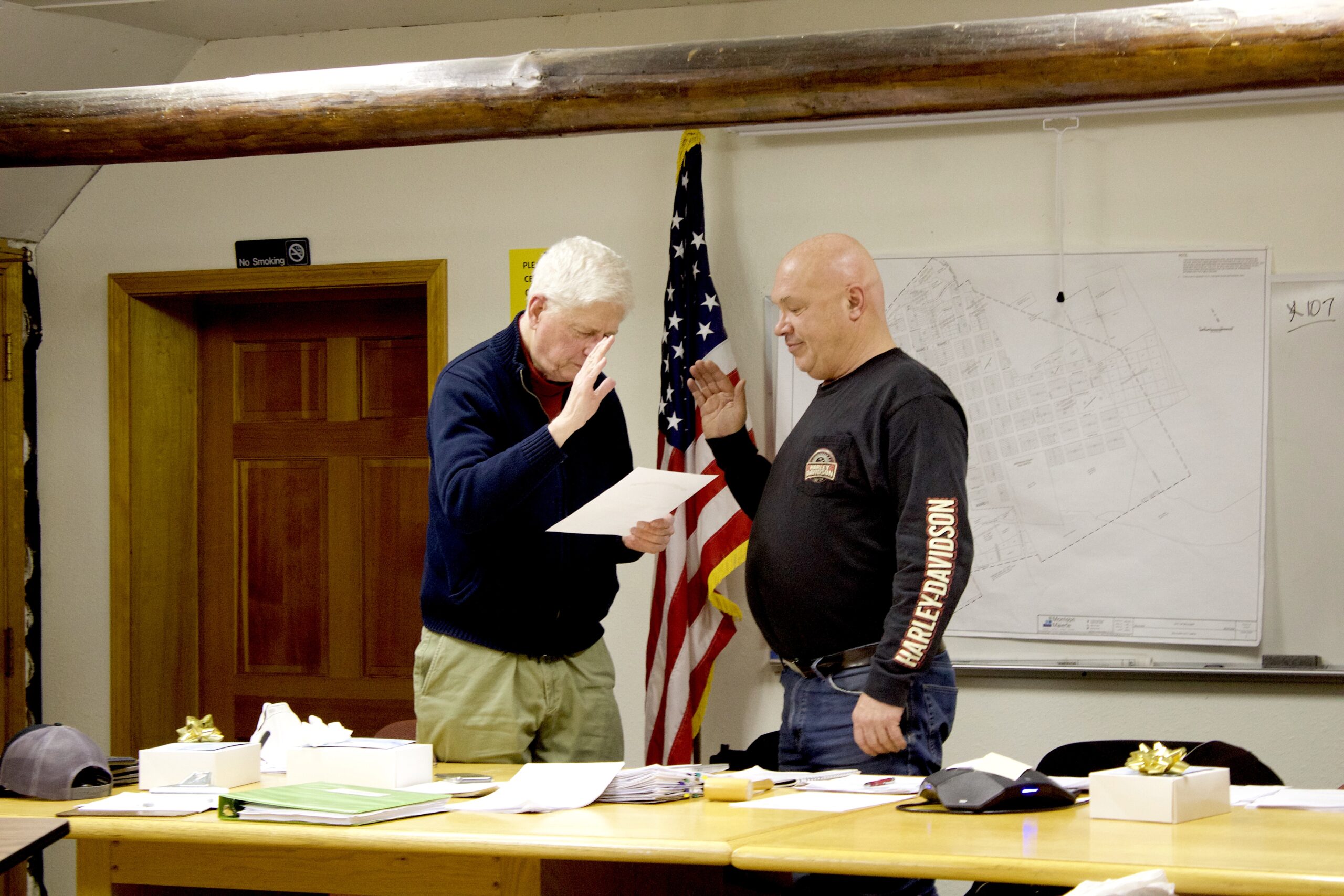 At the Dec. 20 City Council meeting, Boulder Mayor Rusty Giulio takes the oath of office from President Drew Dawson.