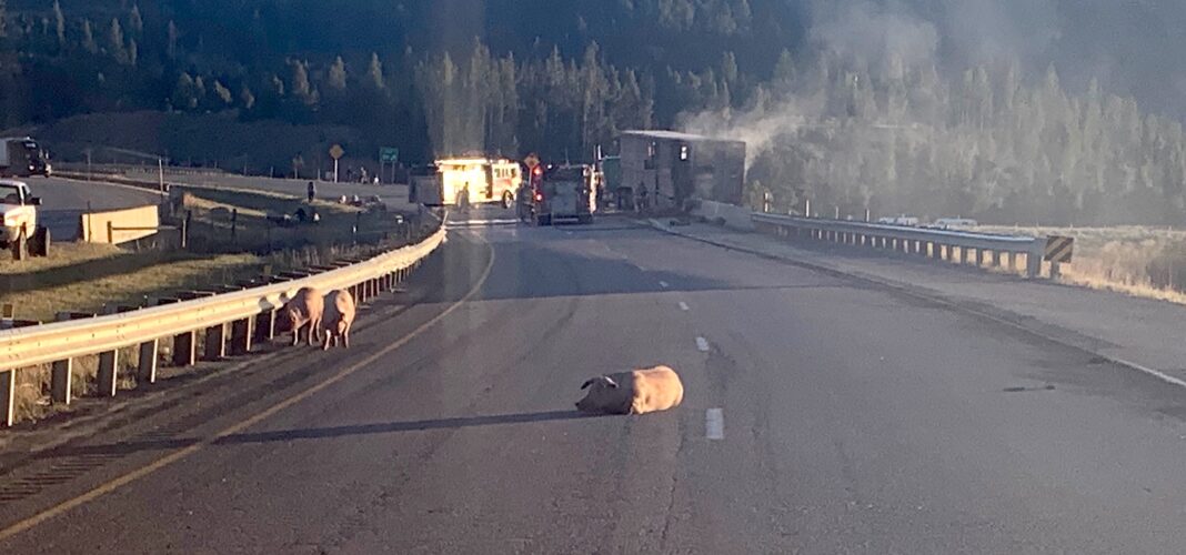 Pigs wander I-15 in the aftermath of Saturday's crash of a semi-tractor-trailer truck near Bernice.