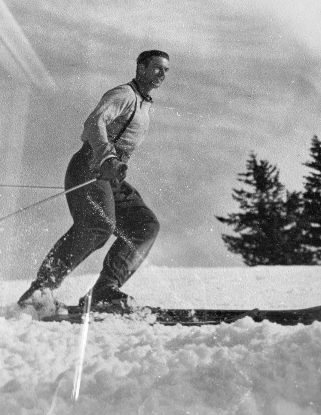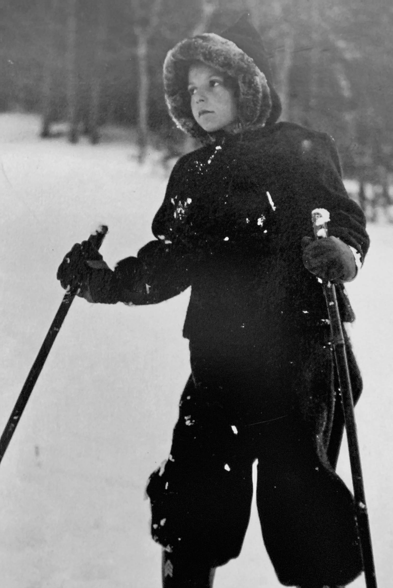 “We left the state because of the war before I became any good at skiing, but my dad was pretty good. To start me off, he would just put me between his legs in front of him. But then he taught me how to snowplow,” she recalled. “The old ski bindings, you know, were not very safe. But I had regular little ski boots and poles. My parents had very good looking ski clothes, probably from Jack Frost, Van Raalte Woolly Wyns—there was a salesman that went around to your home.”