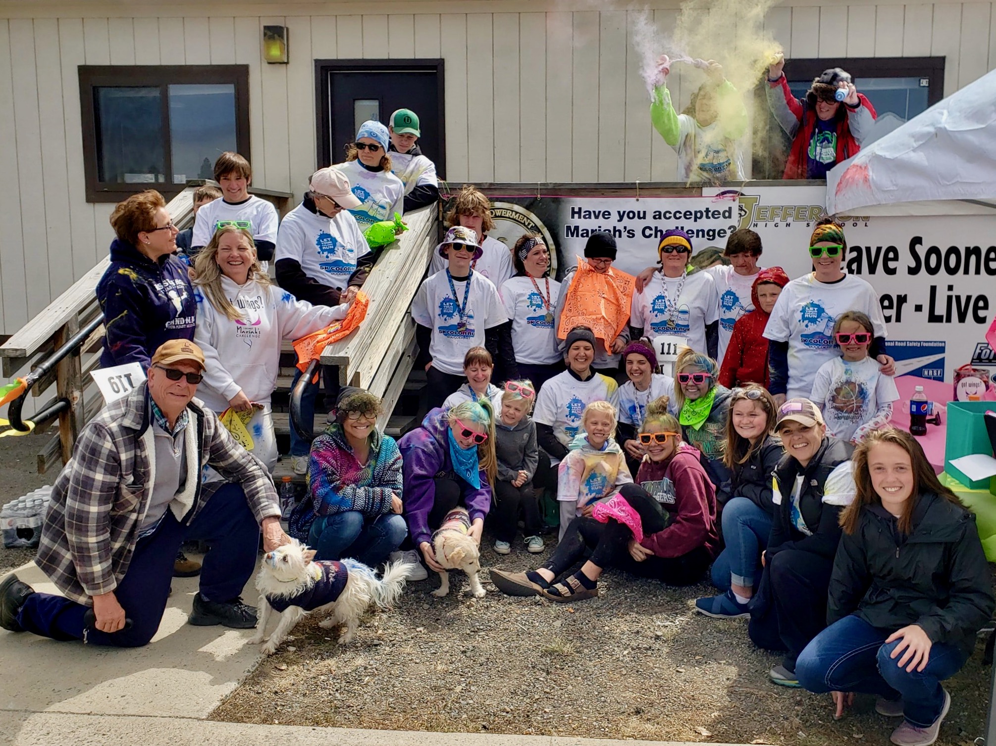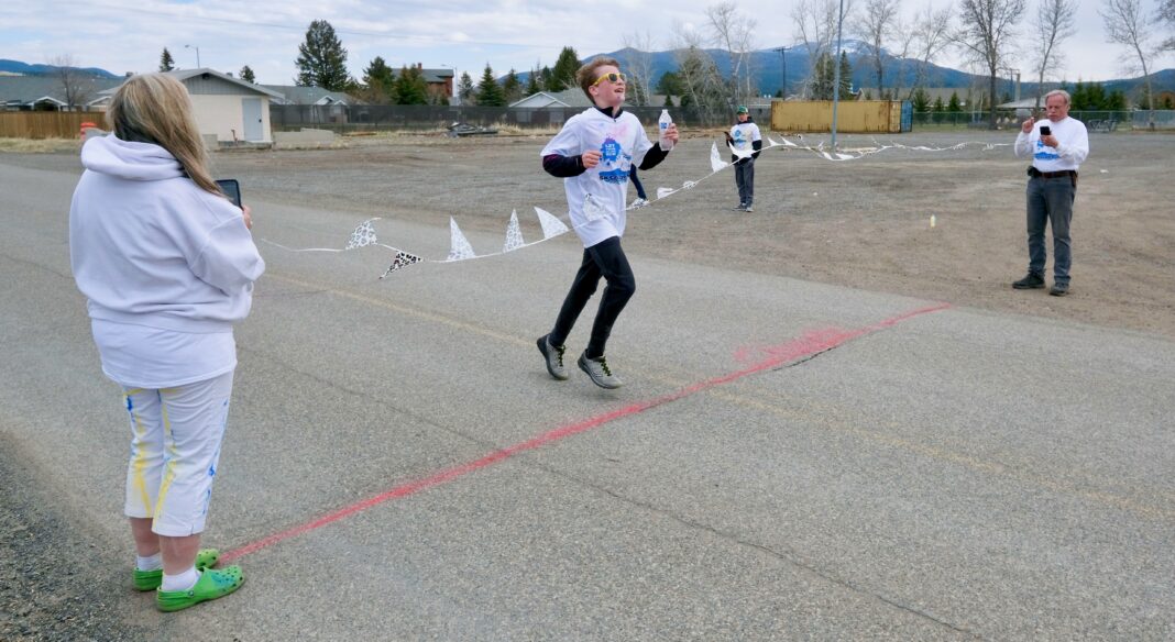 JHS freshman Leo Anderson finishes first the annual Mariah’s Challenge Color Fun Run in Boulder Sunday. About 20 kids and adults ran or walked one mile or a 5K from Jefferson High to city limits and back. The color run — runners are sprayed with colored powder — helps fund scholarships in memory of Mariah McCarthy of Butte, who was killed in 2007 at age 14 by a minor who had been drinking and driving. Holding the finish line are Colleen Teeling, left, and George Teeling.