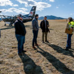 Jefferson County clinic coordinator and Boulder ambulance volunteer Molly Carey, right, chats with Bridger Aerospace employees that flew into Boulder April 16 to deliver the box of protective face shields Carey holds.