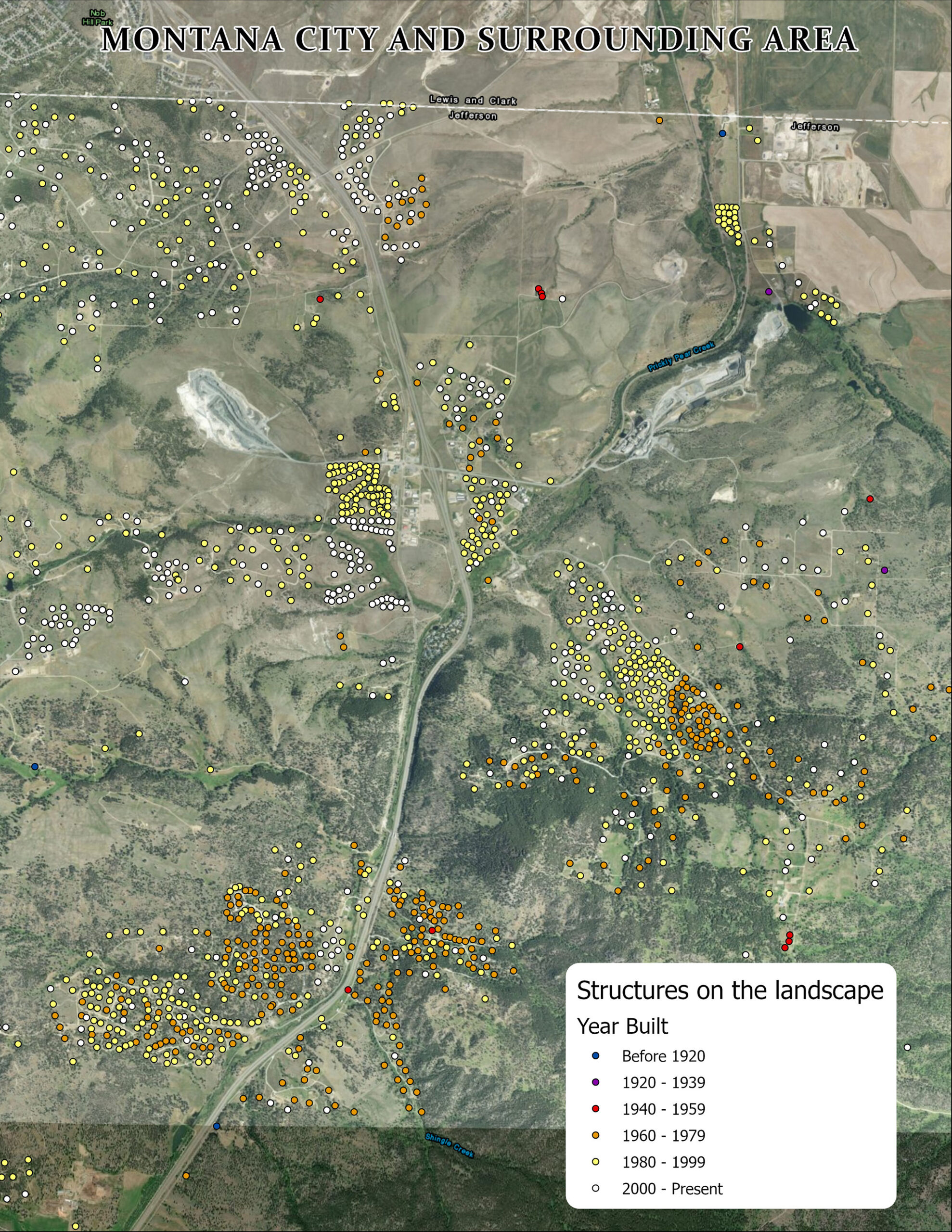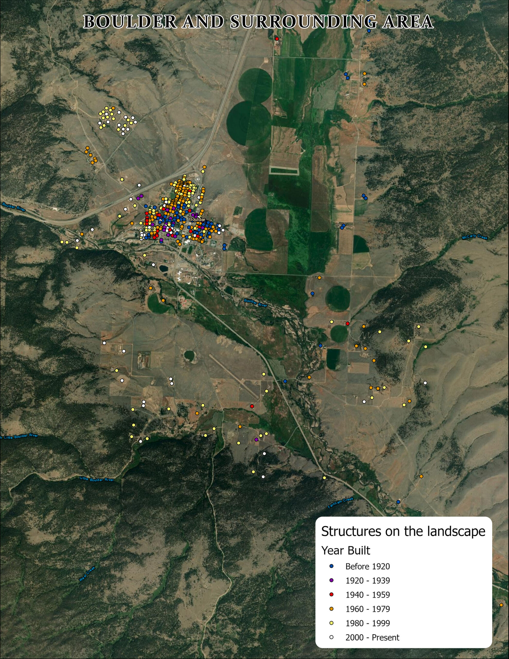 The maps included with this feature show the change. They show the structures of Boulder and Montana City and when they were built. It’s an imperfect dataset, and keep in mind structures could mean homes, barns, businesses, and more. It’s not catching all the structures of our county, as some do not have addresses, and some no longer exist, but it’s a telling representation of the differences of places, and how they’ve changed over time.