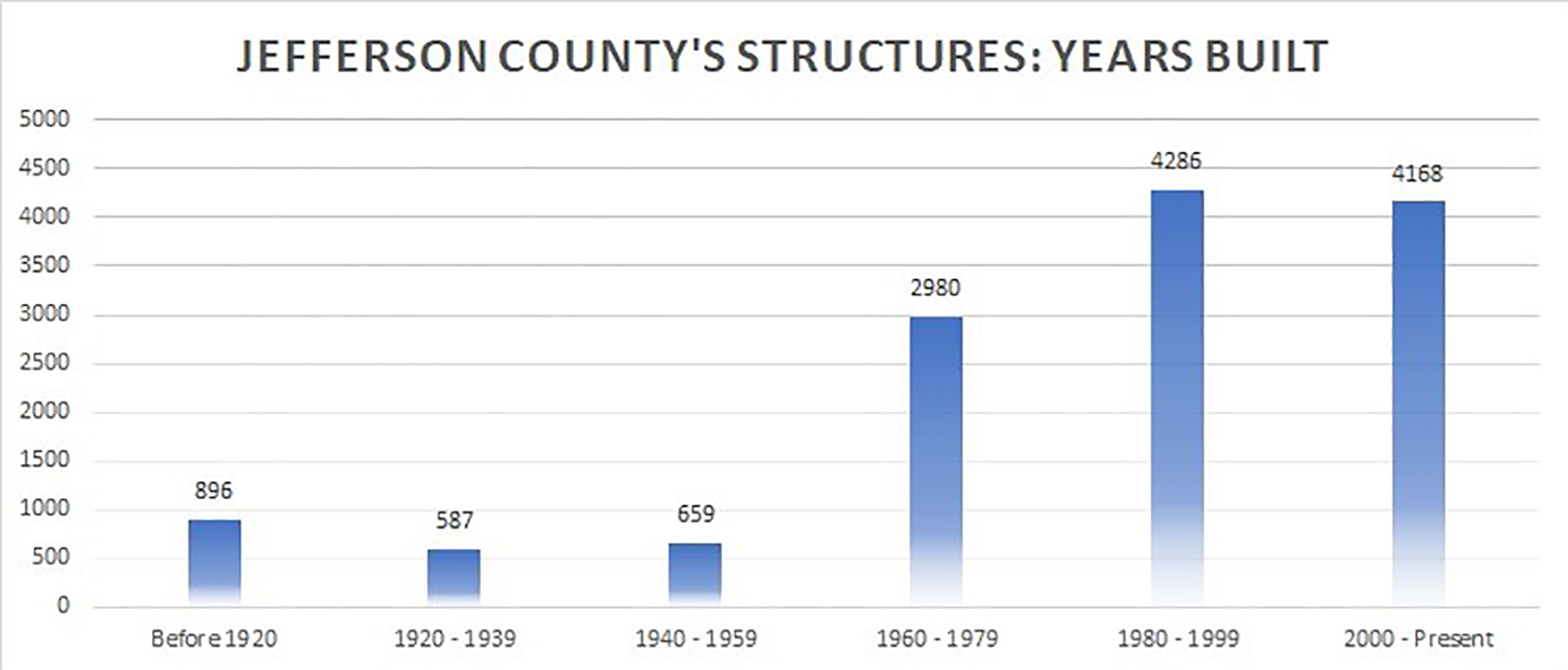 Jefferson County has been around since 1865. We’ve had slow decades of growth, and recently, fast ones. Of the 13,500-ish structures with addresses in Jefferson County, 60% have been built since 1990. That’s kind of interesting, because though the majority of the structures in our county have been built since 1990, our population has only increased around 35% in that same period of time. Folks these days like to build.