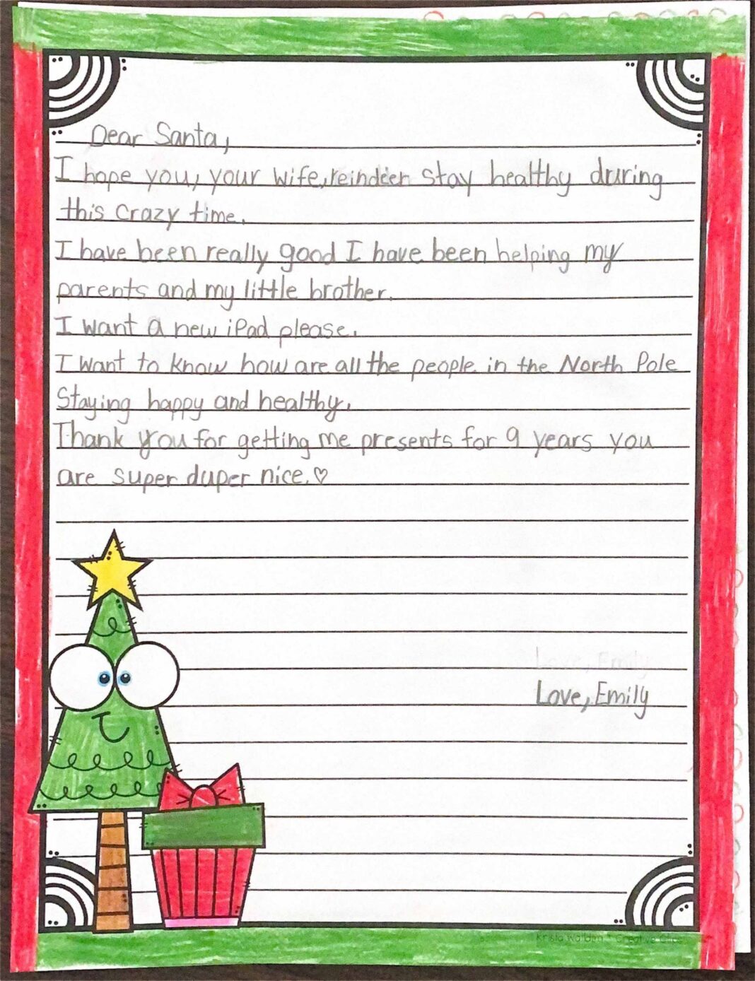 I hope you, your wife, reindeer stay healthy during this crazy time. I have been really good. I have been helping my parents and my little brother. I want a new iPad please. I want to know how are all the people in the North Pole. Staying happy and healthy. Thank you for getting me presents for 9 years. You are super-duper nice.