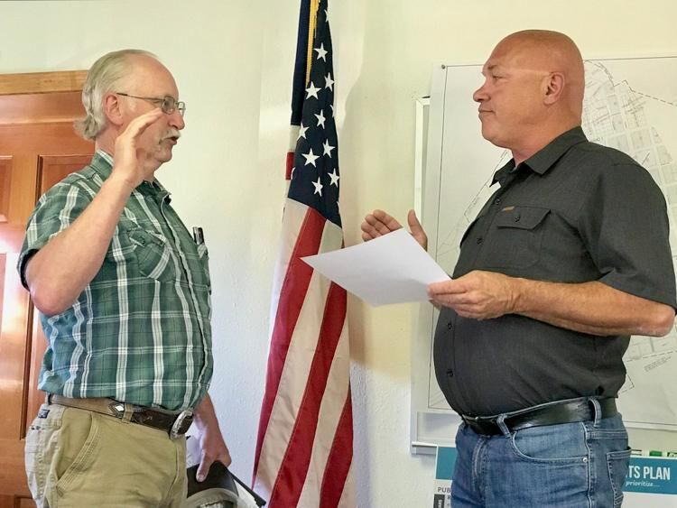 Boulder Mayor Rusty Giulio, right, swears in Gyle Nix as city councilor on Aug. 19, 2019. Nix is terming out at the end of December and encourages others to run. (John Blodgett/The Monitor).