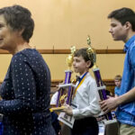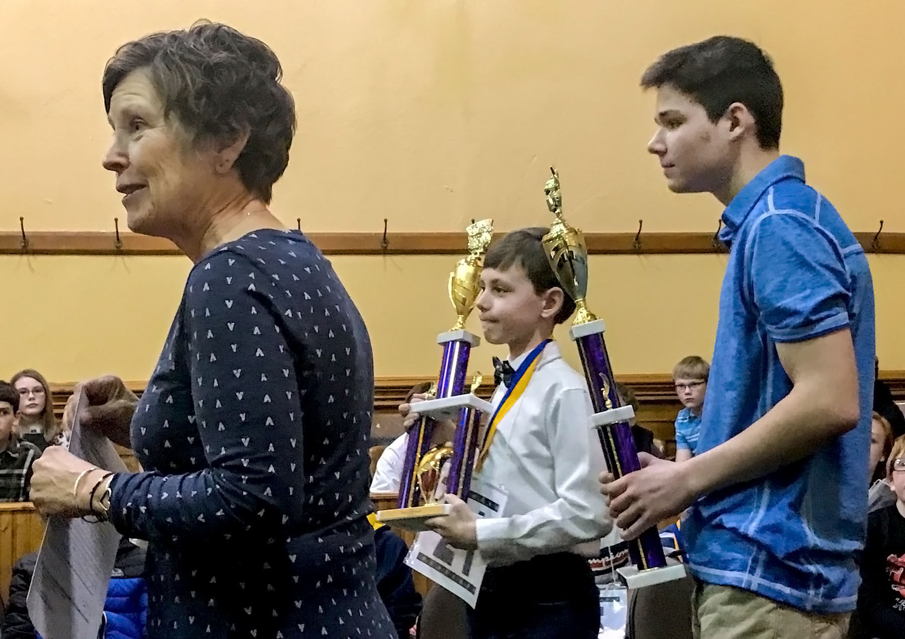 Pam Birkeland, left, Madison County Superintendent and acting Jefferson County superintendent, presents second-place winner and Clancy School fourth-grader Thomas Johnson, center, and first-place winner Christian Gillmore. Gillmore, a Clancy School eighth-grader, will represent Jefferson County at the Treasure State Spelling Bee at MSU on March 14. The winner of that spelling bee will advance to the National Spelling Bee sponsored by the Scripps Company later this year.