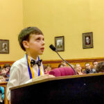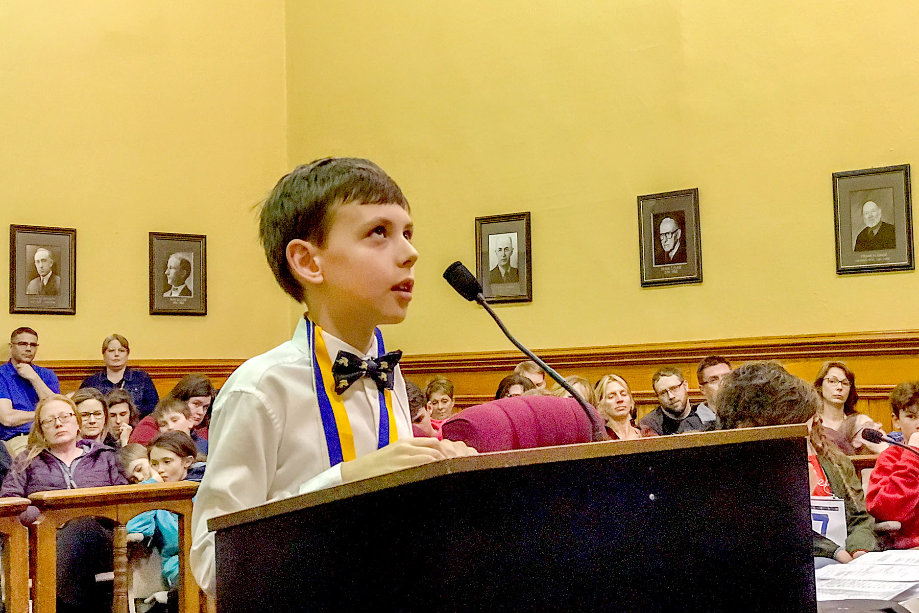 Thomas Johnson, a fourth-grader at Coancy School, concentrates on spelling a word during the Jefferson County Spelling Bee at the Jefferson County Courthouse on Feb. 19. He won second place, behind Clancy School eighth-grader Christian Gillmore.