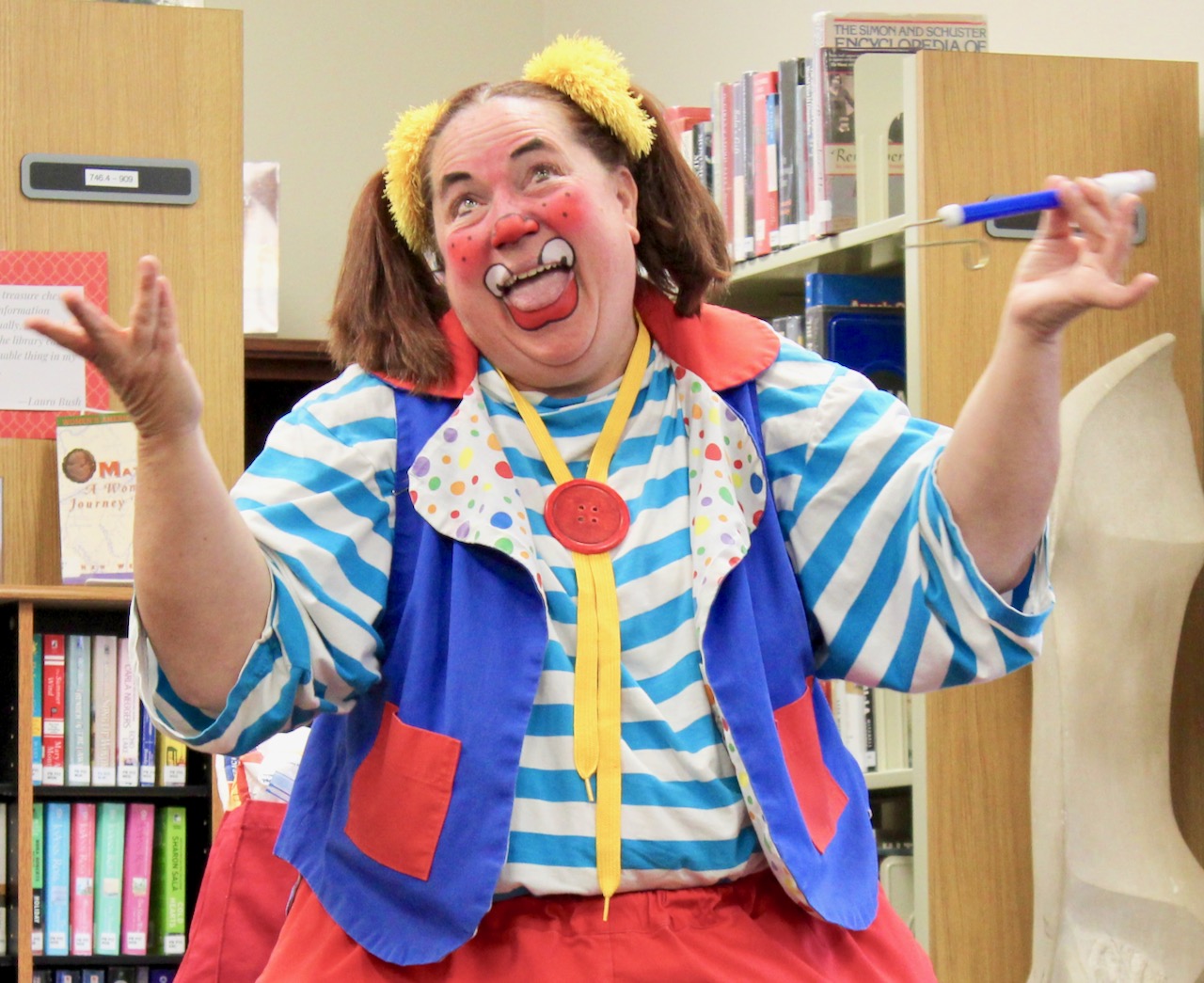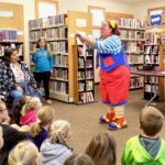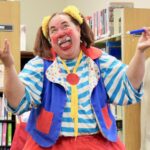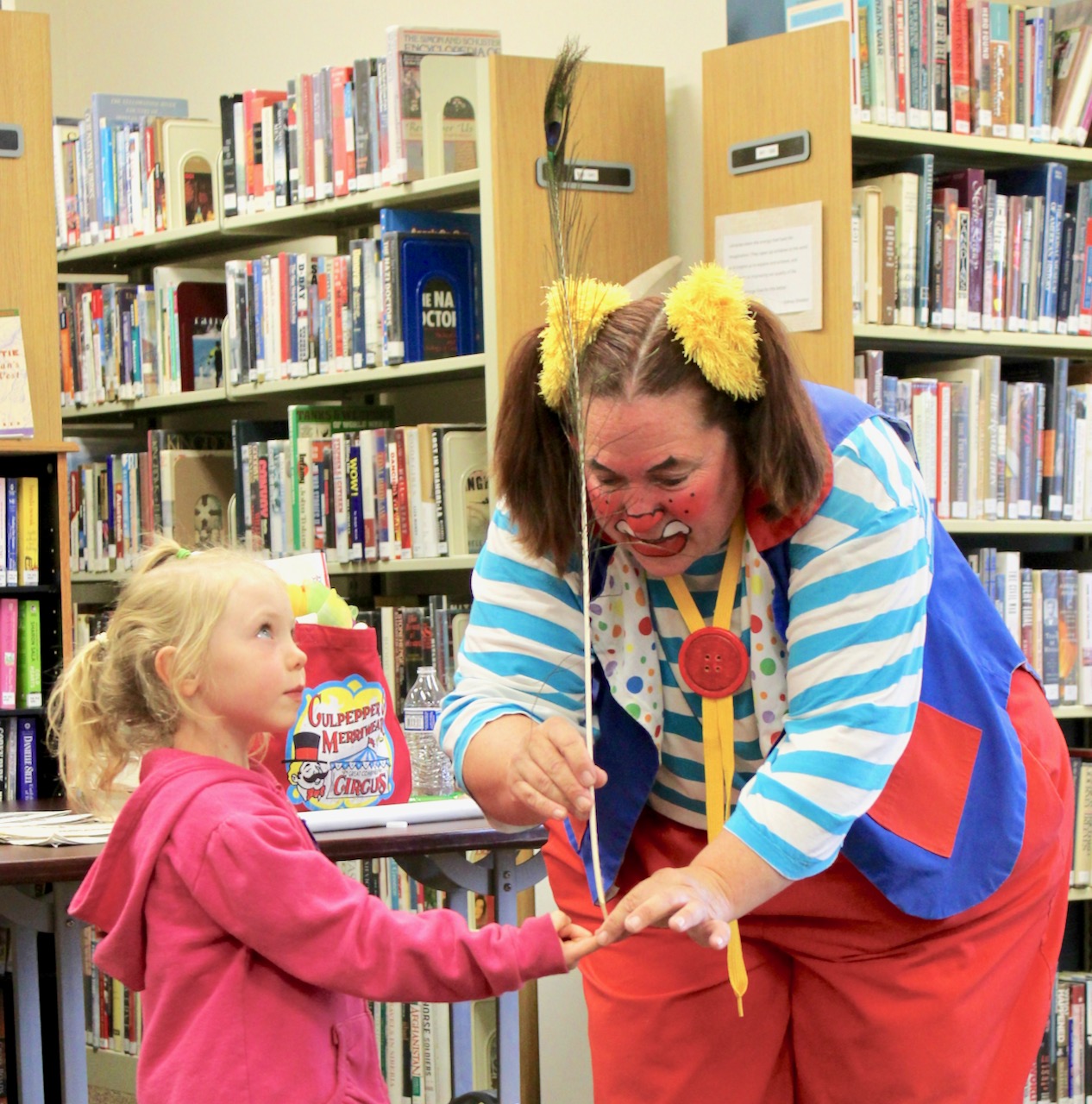 Skeeter the Clown helps Nora Sarchet balance a feather on her finger at Boulder Community Library on June 20.