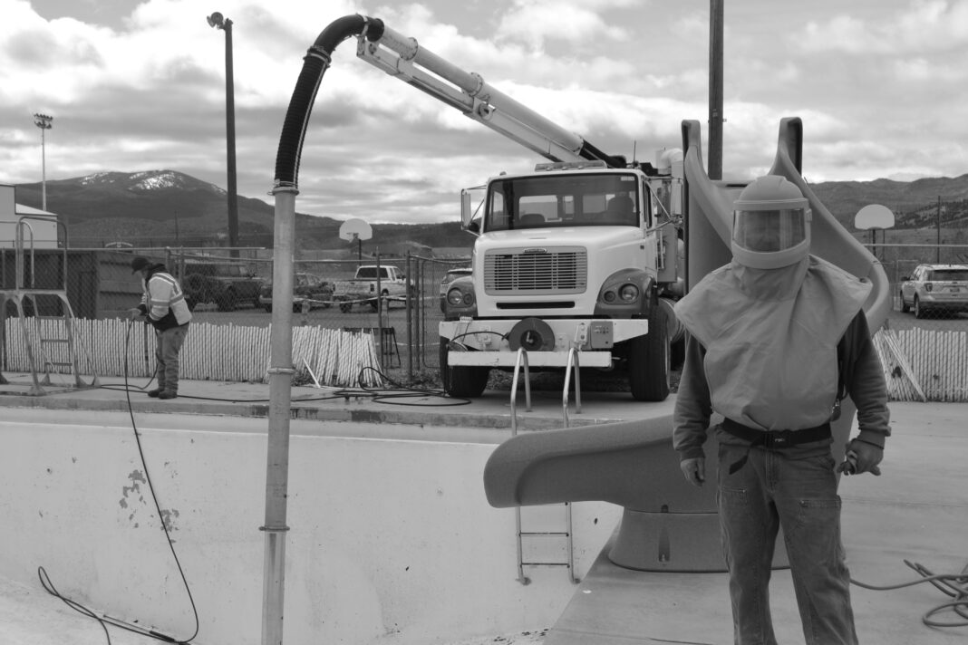Red Dog Painting has sub-contracted Blast Pros Mobile Blasting to begin initial sand-blasting and remove damaged plaster and paint. City officials were uncertain whether or not the pool would be open for the summer season.