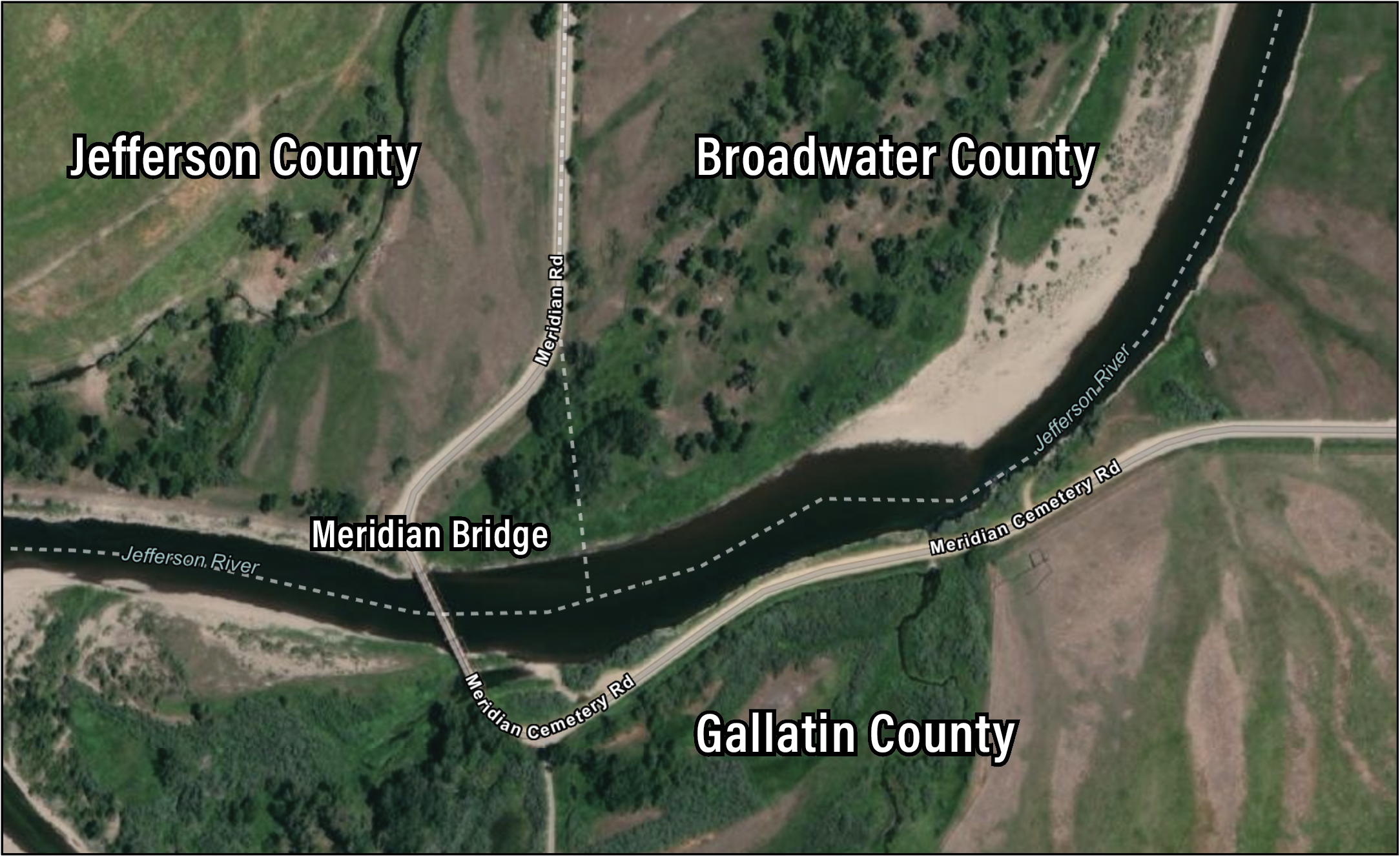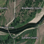Dating to 1914, Meridian Bridge allows Meridian Road to cross the Jefferson River. Though the road itself runs directly along the Jefferson-Broadwater county line as it heads south from Route 287, it veers west—fully into Jefferson County— just before the river, crosses the bridge into Gallatin County and then turns sharply back east, running along the river bank just outside of Broadwater County.