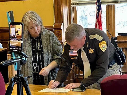 Tom Grimsrud, right, signs documents after swearing in to officially become the new Jefferson County sheriff. District Court Clerk Dori Woods, left, did the honors of swearing him in (Photo courtesy of Tom Grimsrud).