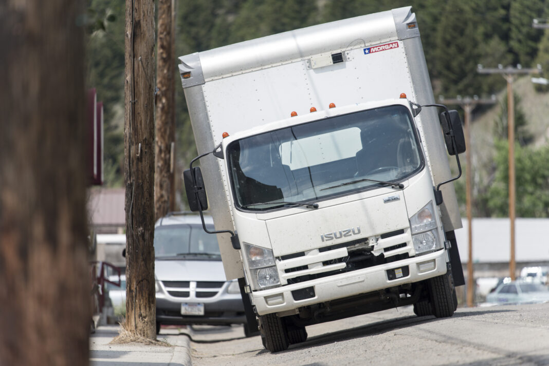 A federal mail delivery truck sits at a severe angle along Basin Avenue in downtown Basin on June 2. A minivan in the background sits level, with its passenger-side wheels up on the curb.