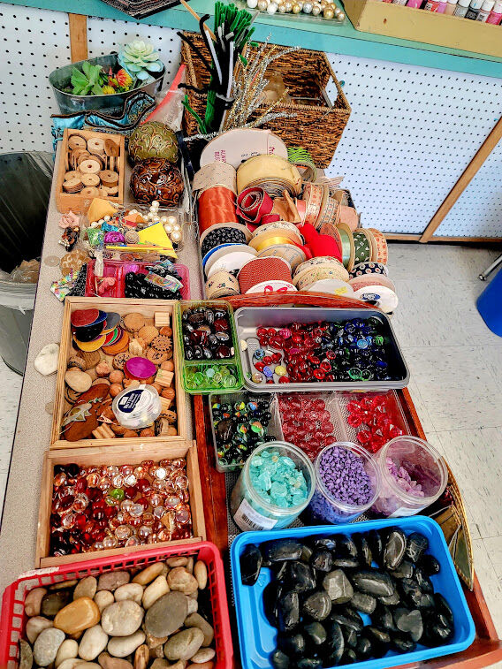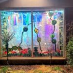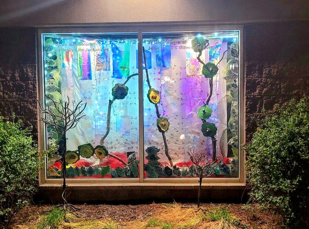 But overall the window shines brightly with a recycled quilt, curtains, sheets, foam core discards, rocks, glitter, and rocks, with dried flowers from long ago all done by the youthful hands of many artists showcasing their talents in another Montana city.
