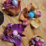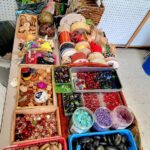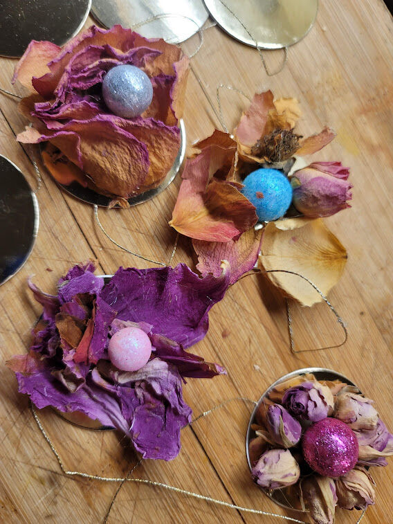 And I had some shiny, circular disks on fishing line from the wedding department at Walmart. I brought out my bin of dried flower petals, roses, and buds. Little girls enjoyed making dried flowers for stringing.