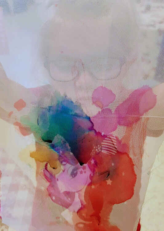 First, I brought in torn up sheer curtains from the thrift store, and I had baby food jars with Ukrainian egg dye in them. With paint brushes and a selection of colors, many stations of artists were able to quickly generate art pieces that they were proud of.
