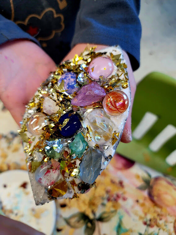 I had left over foam core from projects in my garage, and I cut out leaves with my scroll saw on my back deck. With my bucket of OminI grip from tiling my bathroom, kids were able to make decorative, creative leaves with globbies, sparklies, leftover jewelry, and random rocks. Mixing such collectibles made kids happy with their creations, which were set to dry and packed up