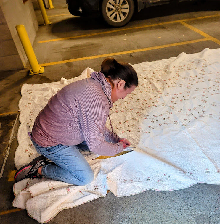 Ferrying supplies over the mountains from Great Falls, having students give it a try to add their imprint, then ferrying the creations back and setting up in a parking garage window is just a part of the process.