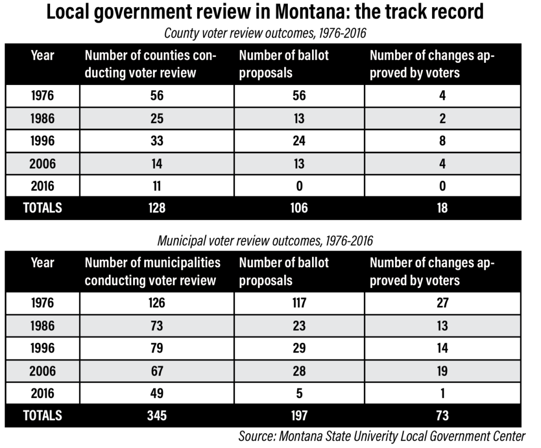 Montana’s state constitution requires that, every 10 years, all municipalities and counties ask voters to choose whether to establish a commission to study their current form of government and consider alternatives.