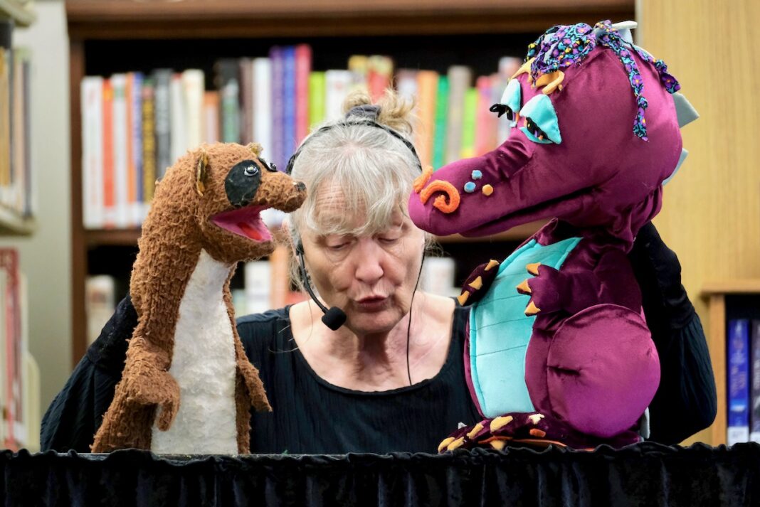 Markie Scholz of South Dakota, a puppeteer known as the “Dragon Lady” and whose company’s name is “Dragons Are Too Seldom,” performs to a few dozen kids at Boulder Community Library on June 24. Librarian Jodi Smiley said she has been coming to Boulder to be a part of the library’s summer reading program for 13 years. The children also enjoyed a drawing giving away free tickets for the Culpepper and Merriweather Circus.