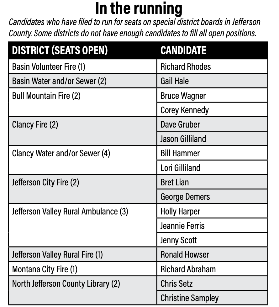 In the Commissioner’s race, only two candidates have emerged to represent Montana City and Elkhorn in county government.