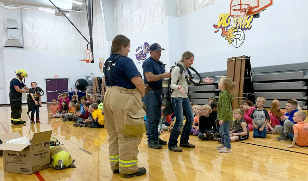 Members of Boulder-Bull Mountain Volunteer Fire Departments went to Boulder Elementary School Oct. 25 to teach about fire safety. In this photo, Fire Chief Mike Hecht, center, puts a SCBA, or self-contained breathing apparatus, on teacher Stephanie Corey as firefighter Amanda Brown watches and firefighter Justin Smith puts on a student at rear left. Firefighter Steve Carey said they were showing the kids and teachers how heavy the equipment was.