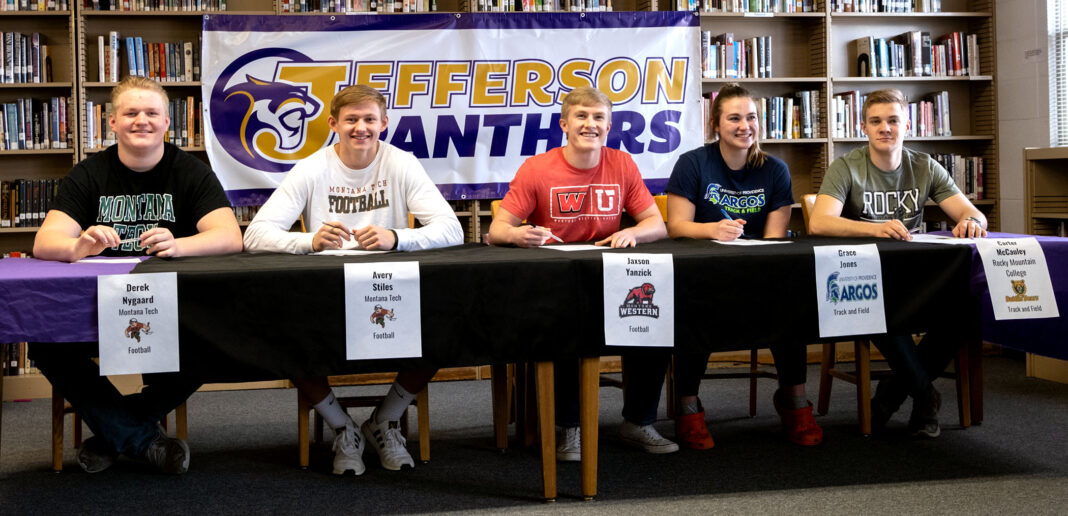 Five Jefferson High athletes participate in signing day in the school library Feb. 5. They are, from left: Derek Nygaard (Montana Tech for football); Avery Stiles (Montana Tech for football); Jaxson Yanzick (University of Montana-Western for football); Grace Jones (University of Providence-Great Falls for track and field); and Carter McCauley (Rocky Mountain College for track and field).