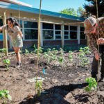 Buffalo Nations student fellowship coordinators Sophia Moreno (Apsáalooke/Laguna Pueblo/Ojibwe-Cree) (left) and Jacob Zimmerer work at the Indigenous gardens at American Indian Hall on the Montana State University campus.
