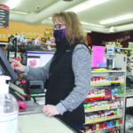 L&P Grocery co-owner Lisa Vossler works the cash register at a check-out area that includes hand sanitizer, frequent disinfecting wipe downs and a plexiglass shield to protect workers. (Diana McFarland/Boulder Monitor).