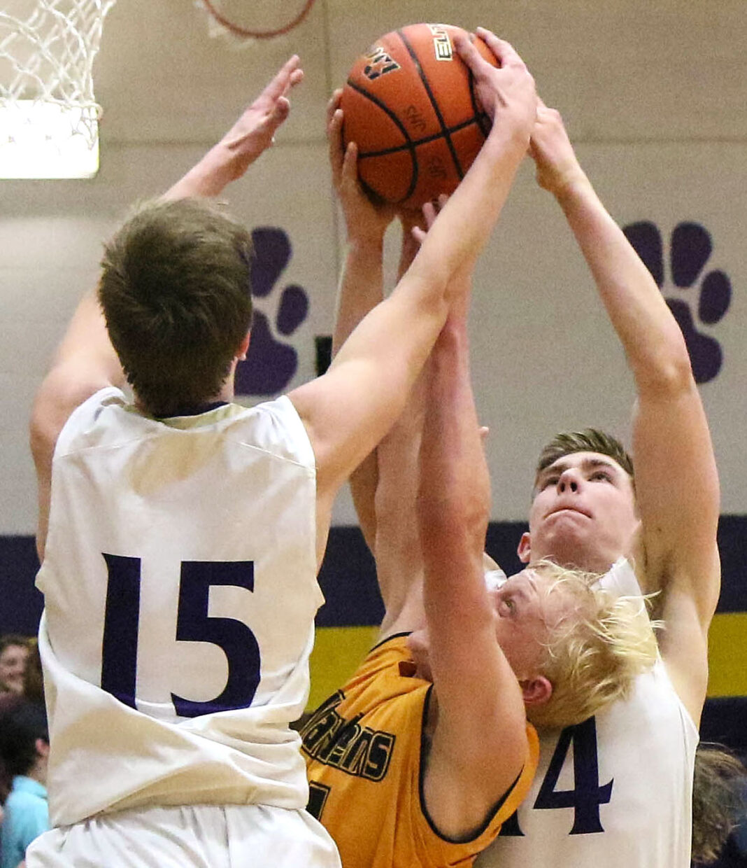 Josiah Williams and Trent McMaster out rebound a Warden player.