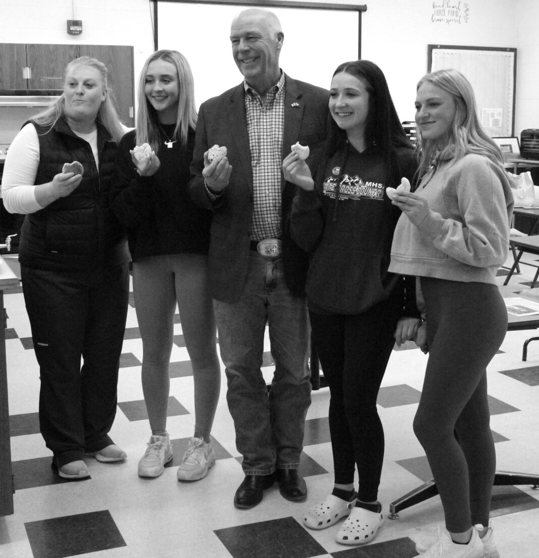 Gov. Gianforte and members of the Family, Career and Community Leaders of America pose with a fresh batch of cookies in hand. (Eliza McLaughlin/The Monitor).