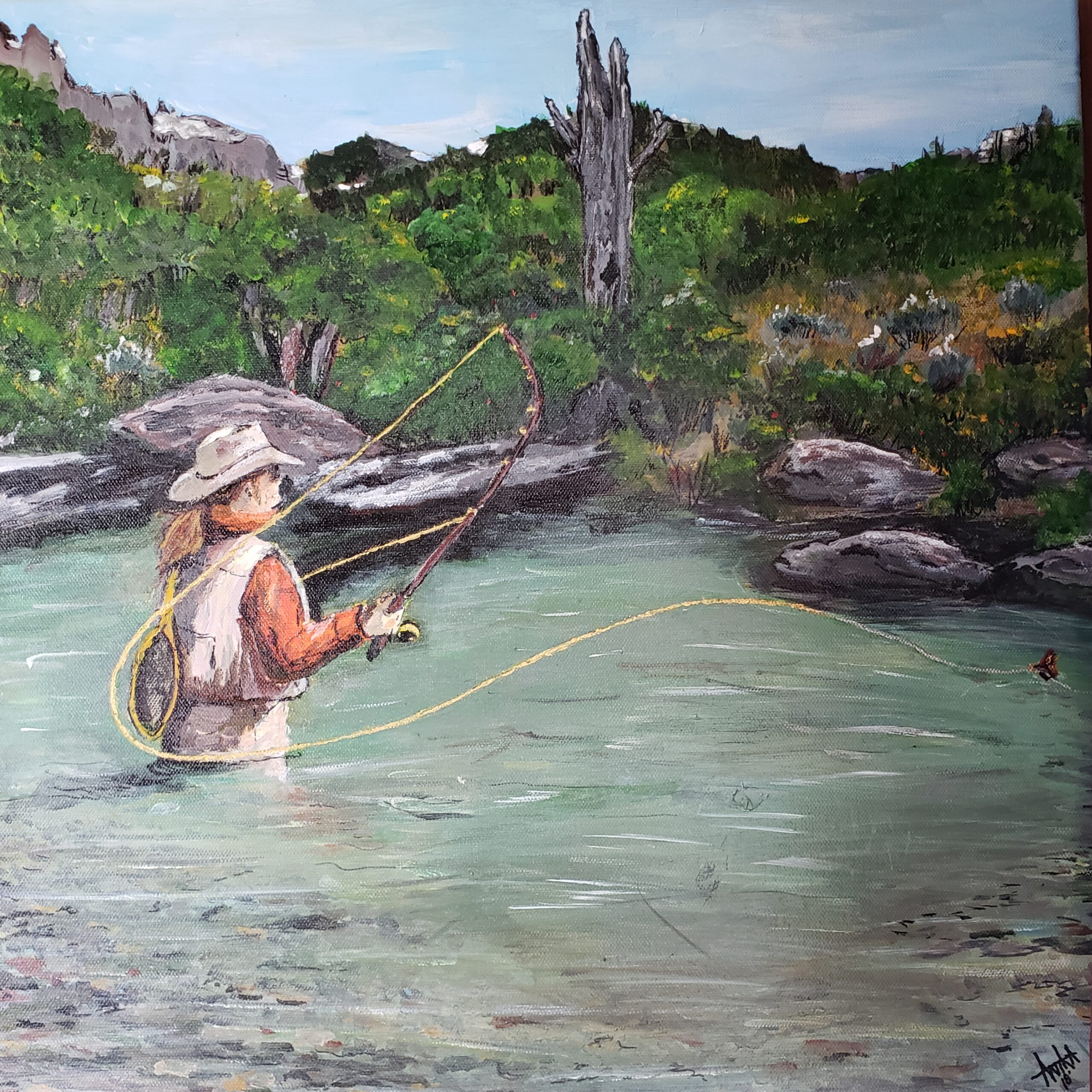 But Anika’s creativity didn’t stop in the classroom.  In 1997, she and a partner created the only coffee stand in Boulder, on a vacant lot next to the Elkhorn Café, for those with a passion for gourmet coffee. She shared her artistic skills by painting the “Have a Swig at Sig’s” mural on the side of a building on Boulder’s Main Street; and painted signs for the Jefferson County Faigrounds entrances along with numerous signs for ranches, friends and family. One of her last paintings was a self-portrait fly fishing on the Boulder River.