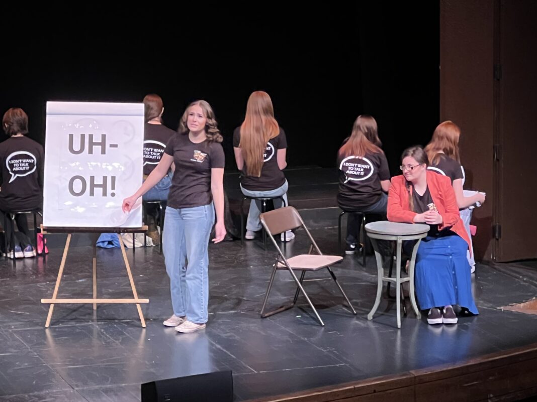 Whitehall High School senior Aletheia Martin (left) and sophomore Jeanette Blazevich (seated) perform a scene during the troupe’s performance of “I Don’t Want to Talk About It” at the 2025 Montana State Thespian Festival. Blazevich was awarded Best Supporting Actress for the collection of roles she portrayed.