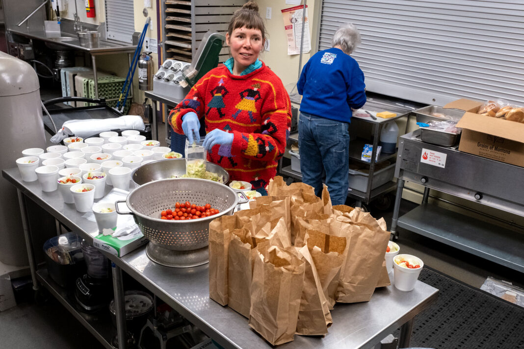 Keha McIlwaine, left, and Kathleen Johnson prepare bag lunches at Boulder Elementary School Wednesday, March 18.