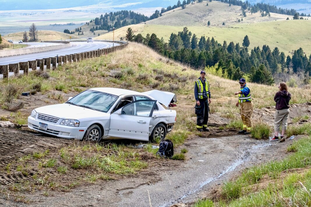 Bull Mountain Rural Fire Chief Cory Kirsch, left, and Boulder volunteer firefighter Richard Burnside, center, investigate a crash along southbound I-15 near milemarker 171 on May 24. Kirsch said the driver, at right, spun off the wet road and crashed into the guardrail, causing the gas tank to rupture. The man, whose name was unavailable at press time, declined transport to the hospital.