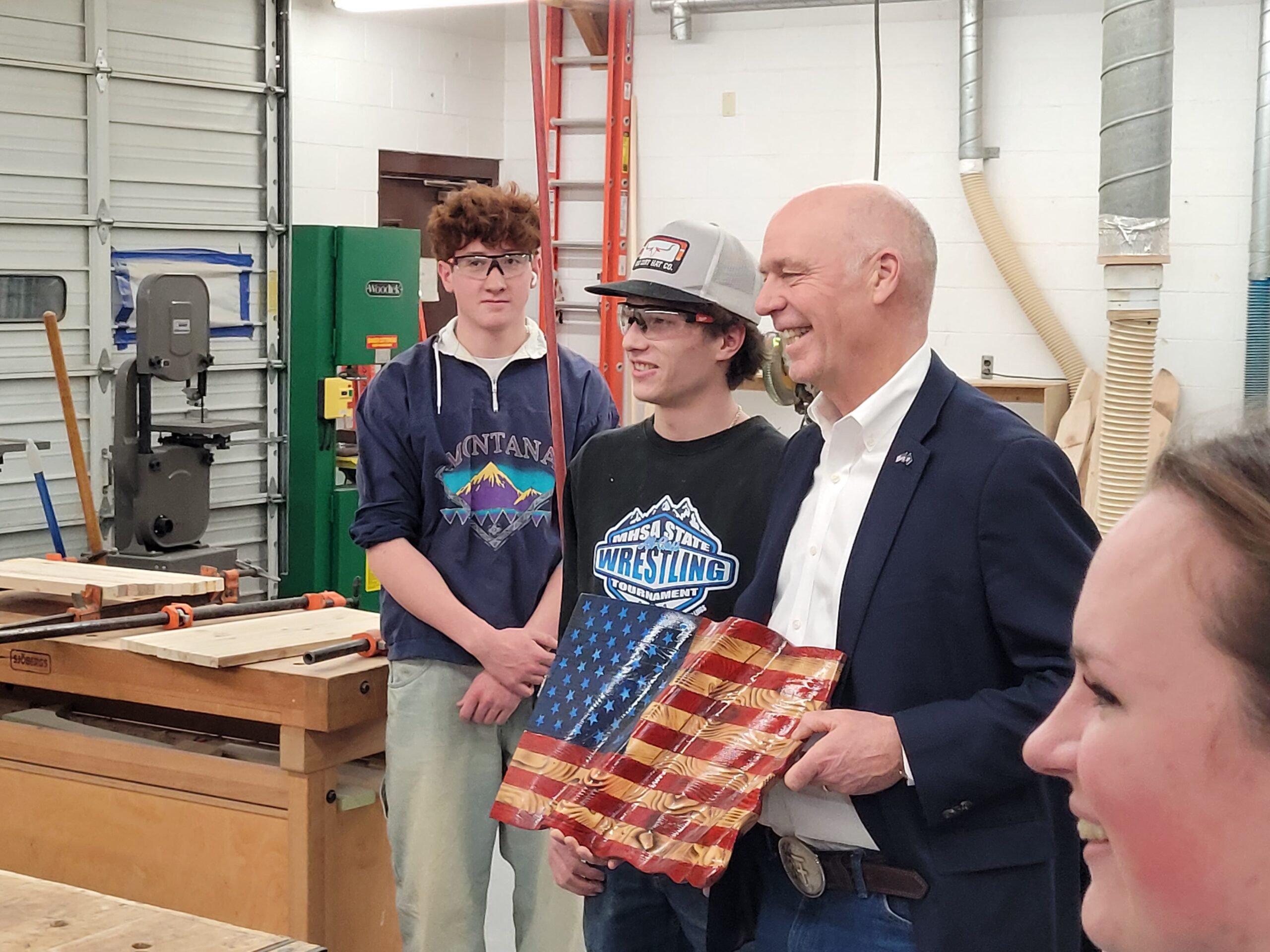 The governor and Representative Marta Bertoglio (R-Clancy) toured the school’s CTE facilities. In a wood shop class, Gianforte talked with students about their ambitious semester-long project to construct a canoe using wood from mostly Montana sources. Eric Gustafson teaches in the wood shop, and he beamed about his students. “We don’t use terms like ‘that’s close enough’ in here,” Gustafson said, showing off a raw cut of one piece of the canoe. “The kids make sure it is all precision. I’m amazed sometimes how much they stay with it and make sure about the details. Those parents are doing something right with those kids.”