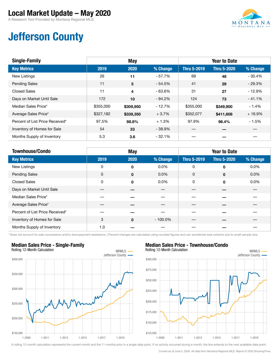 In Jefferson County, sales of single family homes were down 63% from May of last year, as was the median sales price, which fell nearly 13%, according to the Montana MLS. Closed sales in Jefferson County for January through May were also down by 13%, as compared to last year, and the median sales price fell by 1.4%, according to the Montana MLS. Information for June was not available by press time.