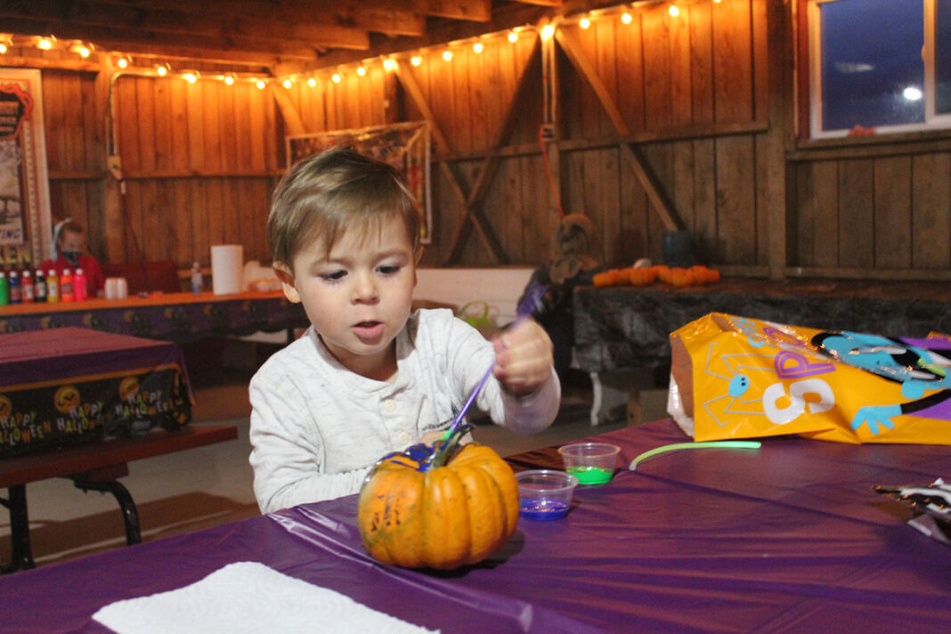 Big Rock Fright Nights kicked off Friday at the Jefferson County Fairgrounds and Recreation Park. The White Barn was decked out in fully frightening Halloween style with plenty of activities for children and adults alike, such as pumpkin painting, crafts, bingo and trivia. The fun continues this Friday and Saturday, Oct. 23-34 and again on Oct. 30, from 6-9 p.m. Admission is free. Pictured: Cassius Brott works on a pumpkin.  (Diana McFarland/Boulder Monitor)
