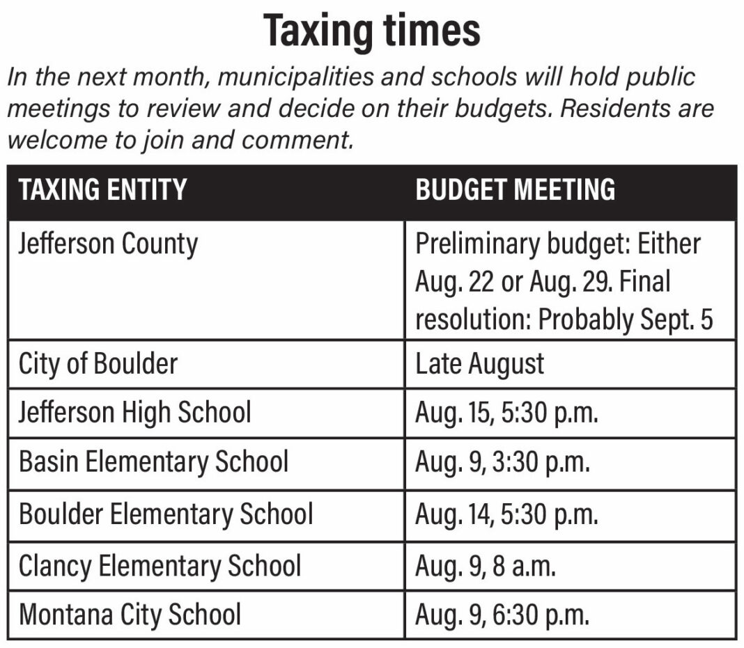 Schools populate their OPI appropriations with expense allocations — and in August, school boards meet to consider the resulting budgets. These meetings are open to the public. This year, the Jefferson High trustees will meet Aug. 15. Basin Elementary, Clancy Elementary, and Montana City School will discuss their budgets Aug. 9, and Boulder Elementary on Aug. 14.