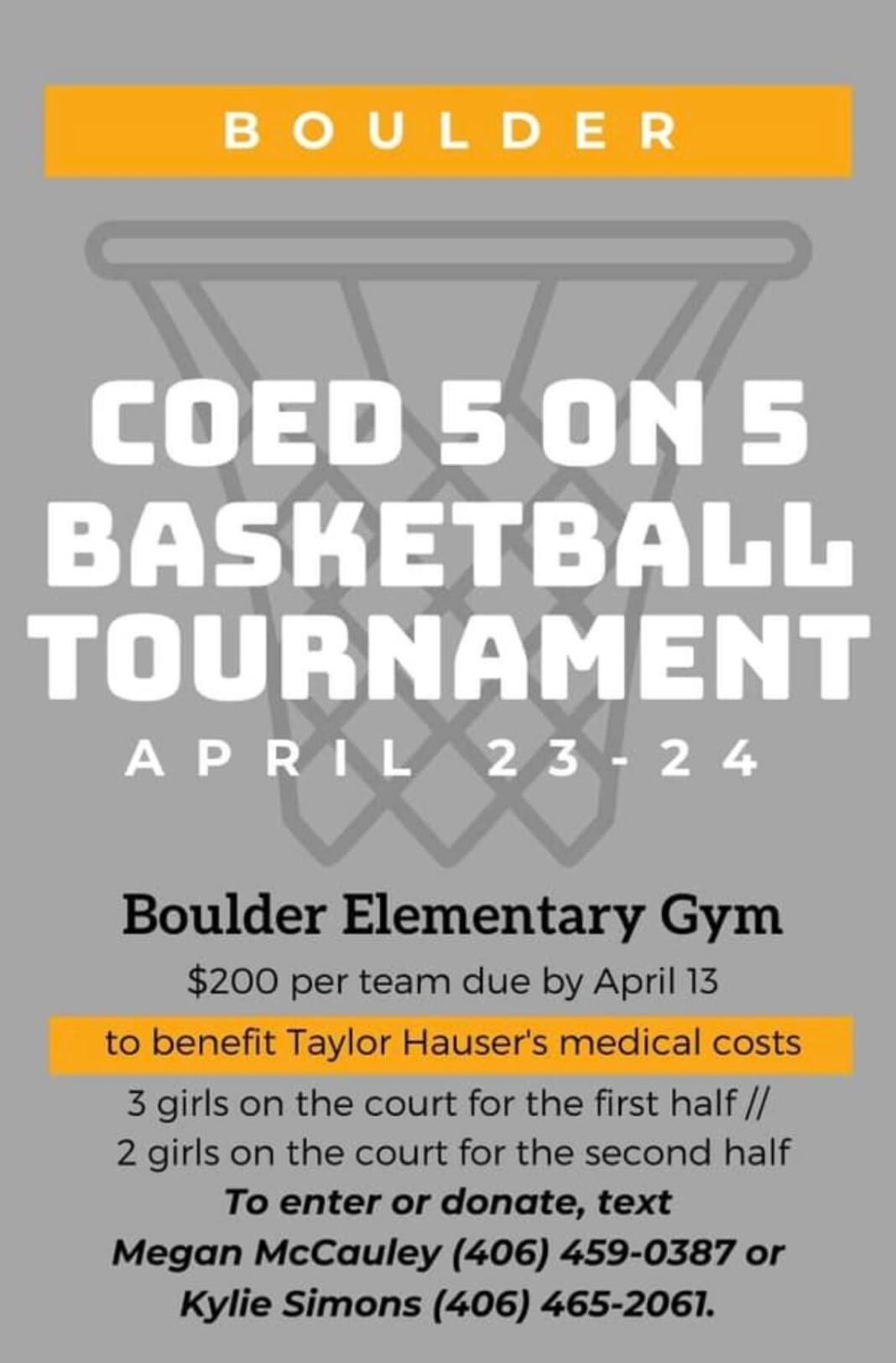 The group initially planned to raise funds for Boulder Elementary School sports as a way to thank Superintendent Jeff Elliott and teacher Devyn Ottman for their support of co-ed adult basketball, including facilitating use of the school’s gym for the tournament. But then, through their longtime friend Glaus, the group learned of the Taylor Hauser’s stroke and the family’s effort to raise funds to cover medical expenses.