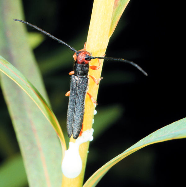 Several insect species have been released on leafy spurge in Montana. The two types that we work with are: 1) the leafy spurge flea beetles (Aphthona spp., six species), and 2) the red-headed stem/root boring beetles (Oberea ethrythrocephala). We also mess a bit with the leafy spurge hawk moth Hyles euphorbiae. The moth is large and is often mistaken for a hummingbird as it hovers and feeds on flowers in the evening. The moth larvae are quite large and are black, red and white-colored with a red spike sticking off the back end. Usually, when an insect is brightly-colored, it is advertising that it is toxic to predators. If you could survive eating just that icky-sticky spurge sap, you would be toxic to predators too. They will also spit an icky green fluid on you if you pick them up. As they grow, the larvae can defoliate several spurge stems. Unfortunately, though they look impressive, they emerge too late in the season to hurt the plant much.