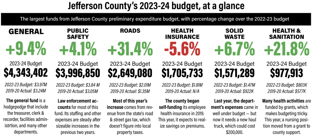 While most county department expenditures for 2023-24 are consistent with last year, some are taking on steep increases. The Roads Department budget will jump to $2.6 million from just over $2 million the previous year. Some of that, Mullen noted, is a function of higher oil prices, which makes road materials and fuel more expensive. In addition, the department is taking on new projects, such as the improvement of Court Street in Basin. And it plans to purchase a motor grader, which levels surfaces — a $160,000 investment, according to Mullen.