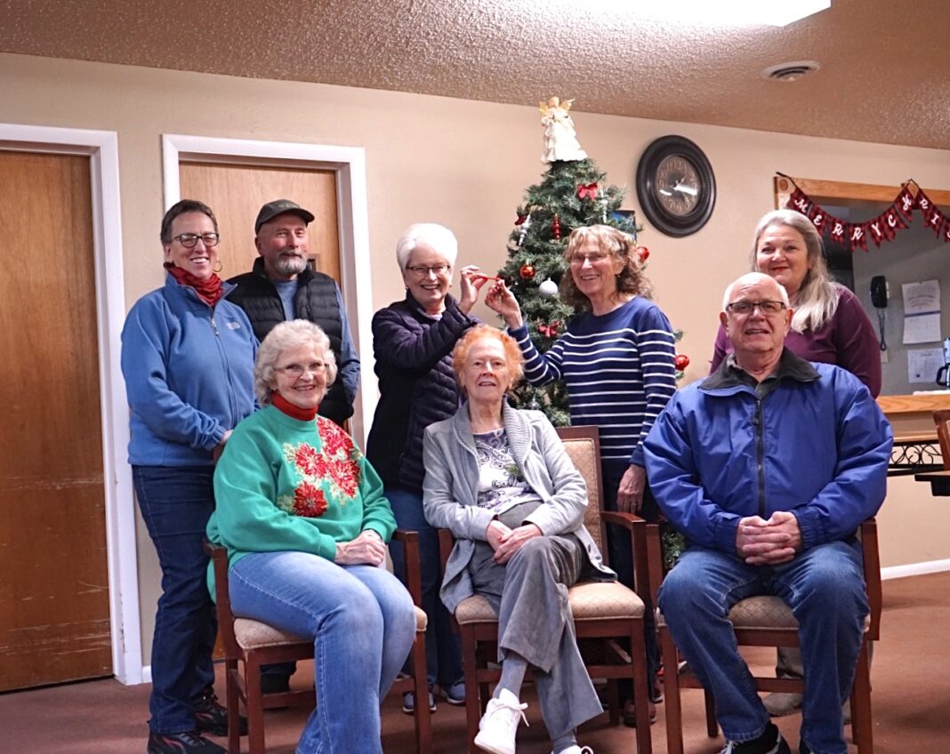 Outgoing president Cathy Dubois (rear, third from left) hands over Jeffco Food Share’s key to new president Priscilla Hedgecock. FRONT: Volunteers Dixie Rennie, Rhea Crelin, Mike DuBois. REAR: Volunteers Vickie Cordeiro and Eric Boxsen, left, and new treasurer Kelly Hert, right.