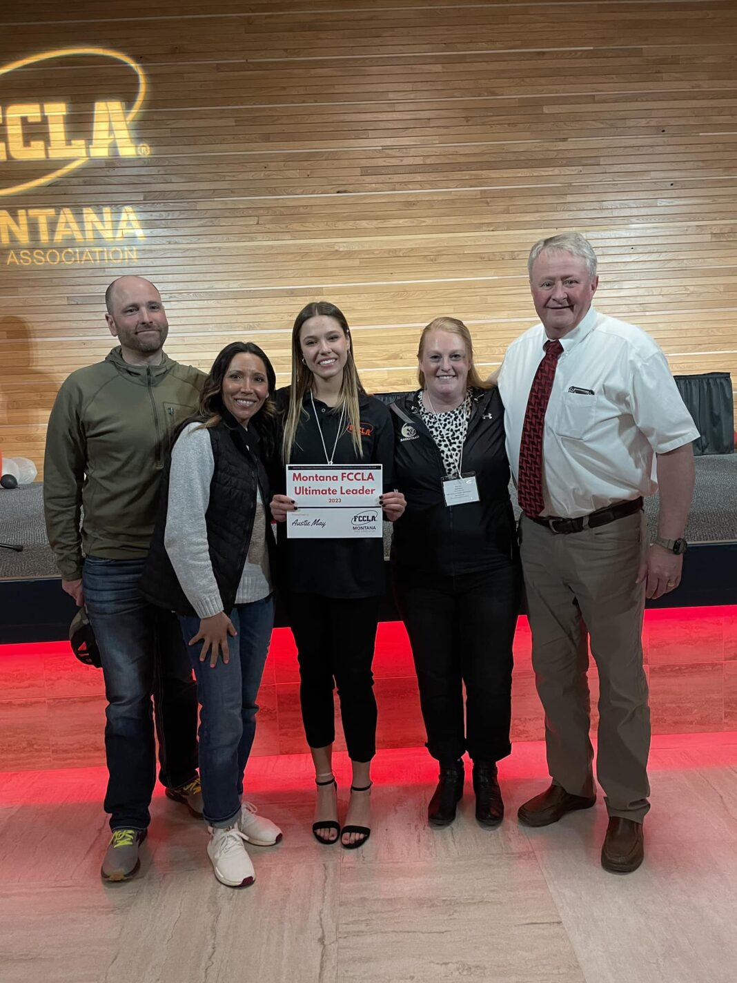 Austie May, center, celebrates being awarded Montana FCCLA Ultimate Leader on March 17. From left, Austie’s parents Jeremy and Linda, Austie, Cassidy Parsons and JHS literary consultant Eric Gustafson. (Photo courtesy of Cassidy Parsons).