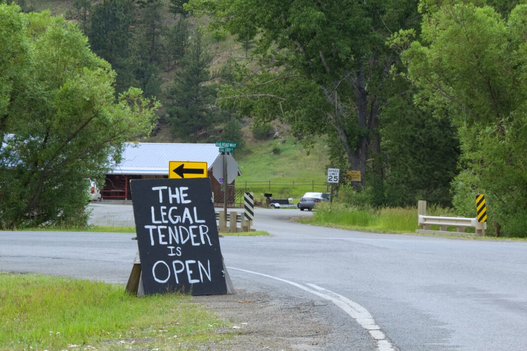 A sign notifies interstate drivers that The Legal Tender is open for business.