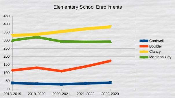Local schools are also seeing a fluctuation in student enrollment totals. According to statistics provided by the Office of Public Instruction dashboard, Clancy and Boulder Elementary Schools have seen a significant rise in enrollments during the past 5 years. Montana City School, however, has shown a decline in enrollments during the same period. Cardwell School in the southern part of Jefferson County has stayed at about the same level of students for the past 5 years.