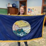 Basin School custodian Lettie Smith holds up an old Montana flag she found while cleaning out the rooms on the top floor. This is one of many treasures she found during the intensive clean-up. (Charlie Denison/The Monitor).