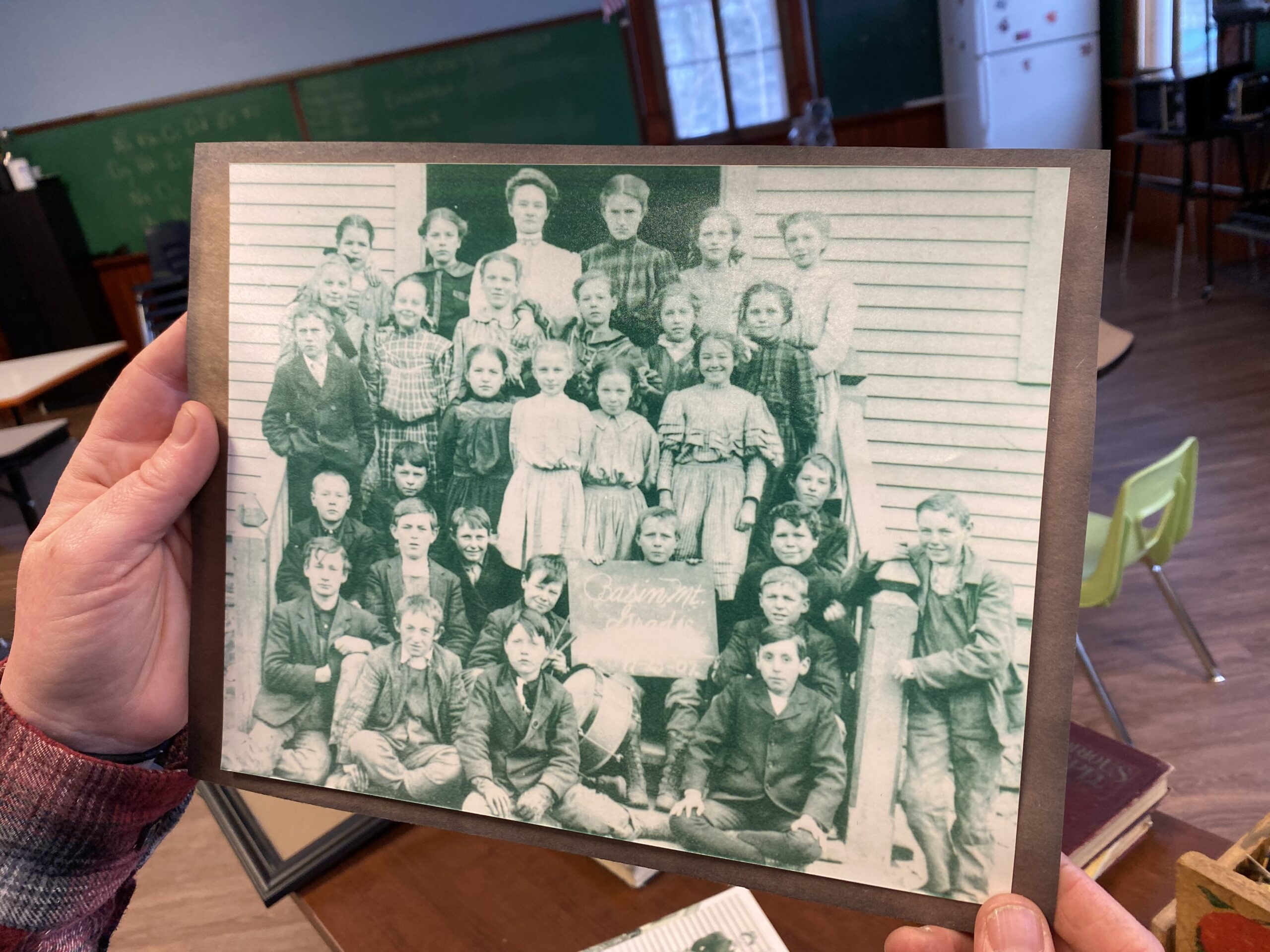 “Here’s a photo dated back to 1908,” she said, lifting a class photo taken by the Basin School’s front doors. “It says here on the back of the photo that ‘third row from the right is Isabell Lowry, and leaning by the post is Ned Lowry.’”