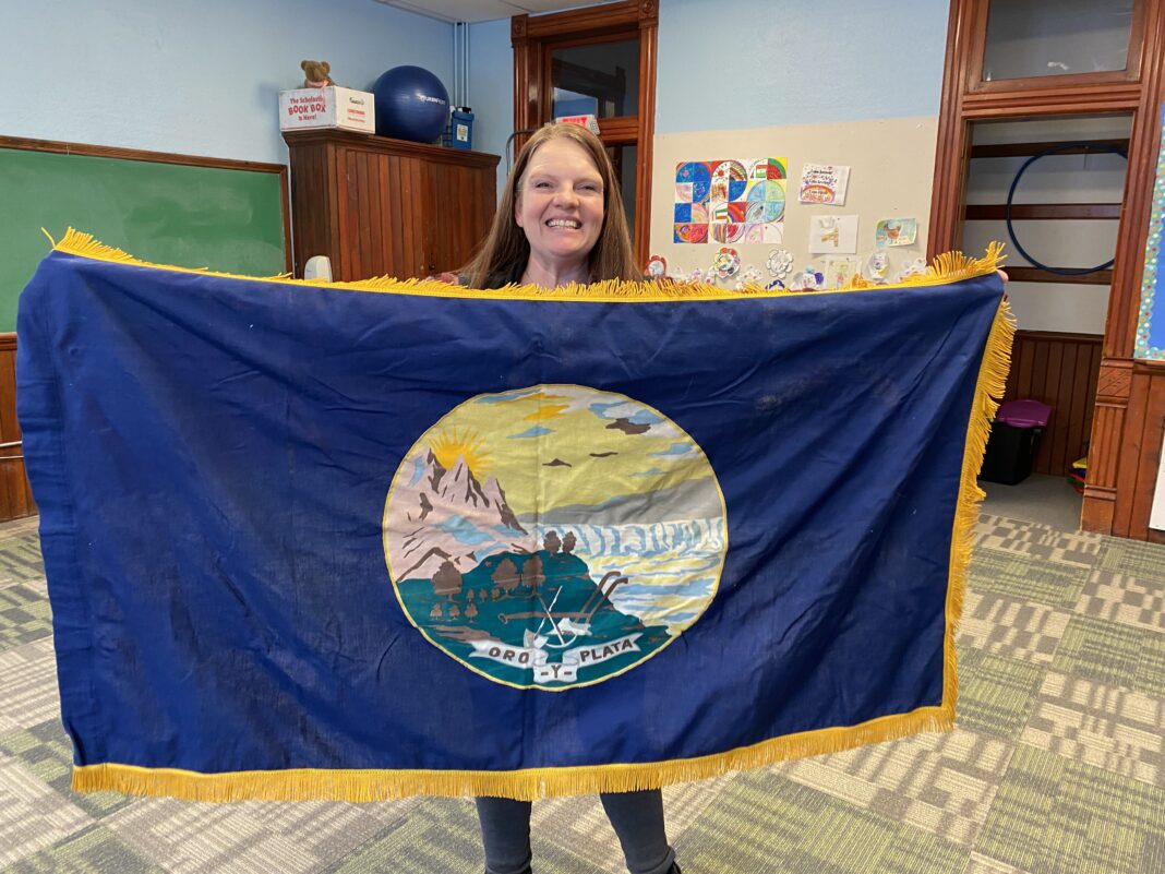 Basin School custodian Lettie Smith holds up an old Montana flag she found while cleaning out the rooms on the top floor. This is one of many treasures she found during the intensive clean-up. (Charlie Denison/The Monitor).